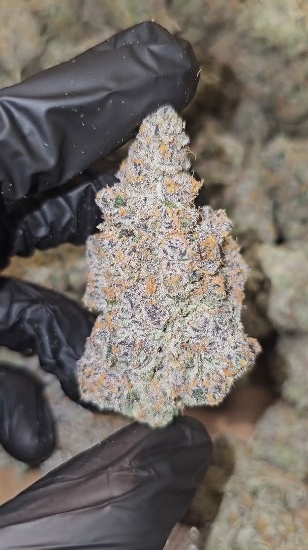 Super Boof is visually stunning — we’re talking giant, chunky colas that look like they’ve been pumped with plant steroids (but, you know, naturally 😉). These dense nugs are drenched in crystal trichomes, showcasing a rich green base color, deep purple hues, and vibrant orange hairs 🔥💜🧡. It’s like looking at a masterpiece that happens to get you very lit.